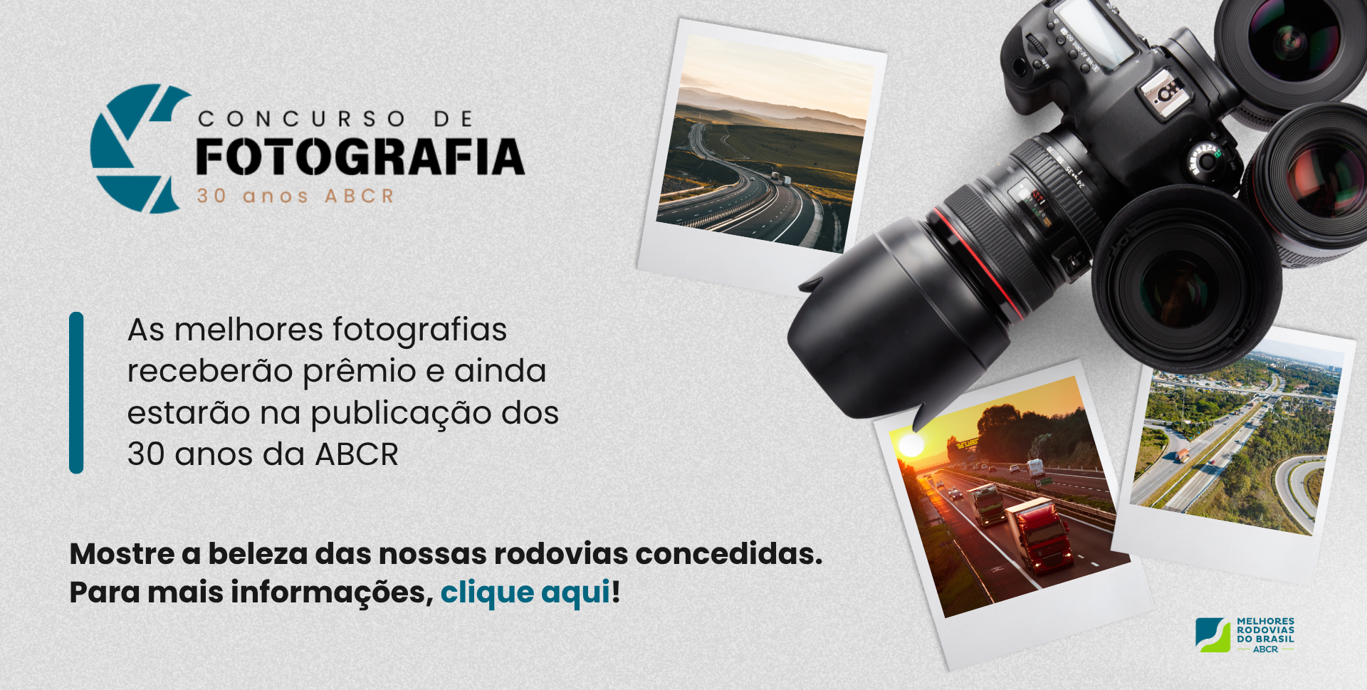 Em celebração aos seus 30 anos de atuação, a Associação Brasileira de Concessionárias de Rodovias (ABCR) convida o público a participar do Concurso de Fotografia – 30 anos ABCR, uma iniciativa que visa reunir registros visuais da evolução das rodovias brasileiras sob gestão das concessionárias associadas.